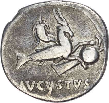 Bare head of Augustus left. Rev. Capricorn right, holding globe with rudder, cornucopiae behind, AVGVSTVS below. (RIC 130). Fair.