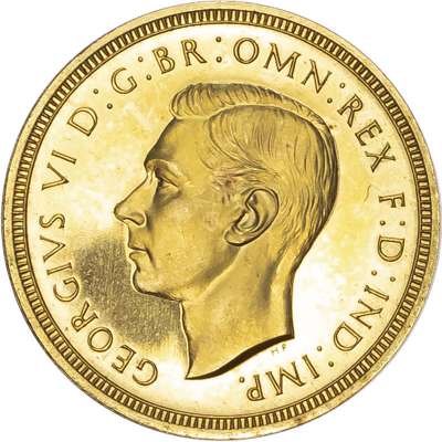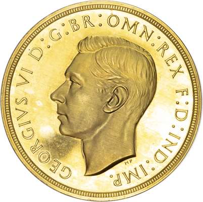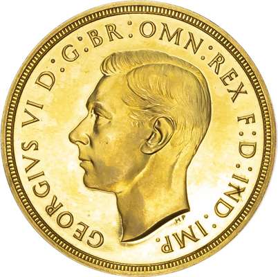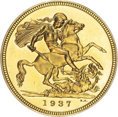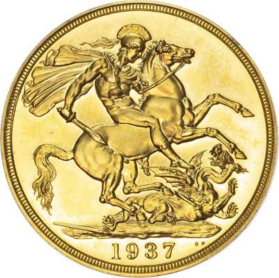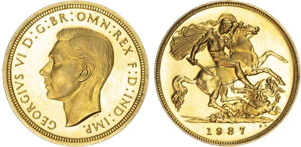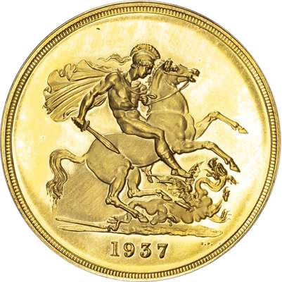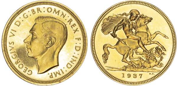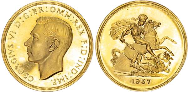 George VI (1936-52), Gold proof Set, four coin set issued in 1937, Coronation year, Five Pounds, Two Pounds, Sovereign and Half-Sovereign, with bare head of King left, HP raised below for designer Humphrey Paget, legend and outer border surrounding, GEORGIVS VI D: G: BR: OMN: REX F: D: IND: IMP. Rev, Saint George slaying the dragon right, date in exergue, B.P. to upper right of exergue for Benedetto Pistrucci, edges plain, housed in original maroon Royal Mint case. Mintage 5,501 (S.PS15; W&R: 435,437,439, 442). As struck, light reddish tone. Only the slightest of hairlines. A delightful set.