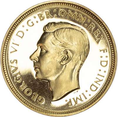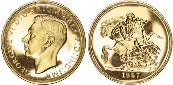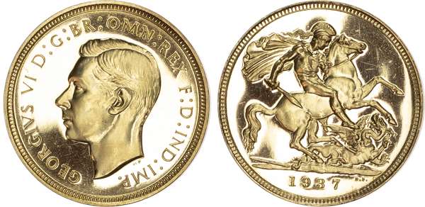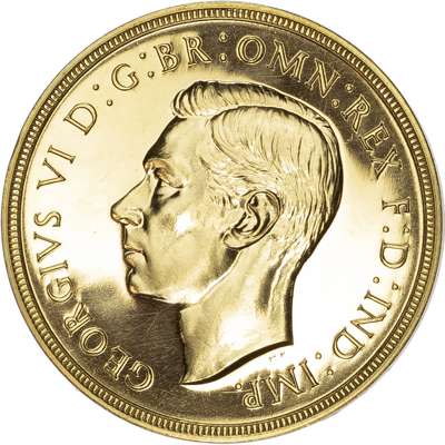 Comprising Five Pound, Two Pound, Sovereign, and Half Sovereign. Bare head left, HP raised below for designer Humphrey Paget, legend and outer border surrounding, GEORGIVS VI D: G: BR: OMN: REX F: D: IND: IMP. Rev, Saint George slaying the dragon right, date in exergue, B.P. to upper right of exergue for Benedetto Pistrucci, edges plain. In original maroon case of issue with black velvet inlay (sound) (S. PS15; W&R: 435, 437, 439, 442). Mintage 5,501. All four coins About As Struck, a very pleasing set.