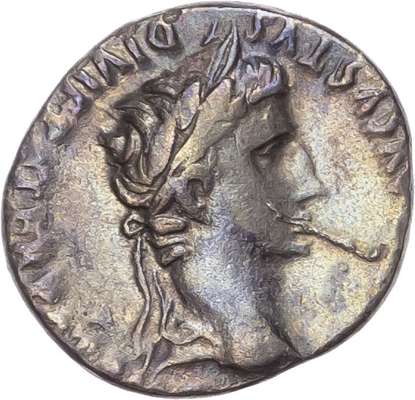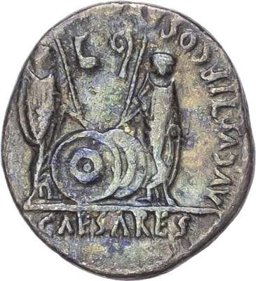 CAESAR AVGVSTVS DIVI F PATER PATRIAE, laureate head of Augustus right. Rev. AVGVSTI F COS DESIG PRINC IVVENT / C L CAESARES, statues of Gaius and Lucius Caesars, togate, each holding a sceptre and resting hand on a shield, lituus and simpulum above. (RIC 207; BMC 533; RSC 43). Fine. Die break to obverse.