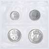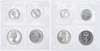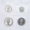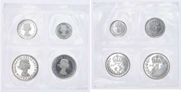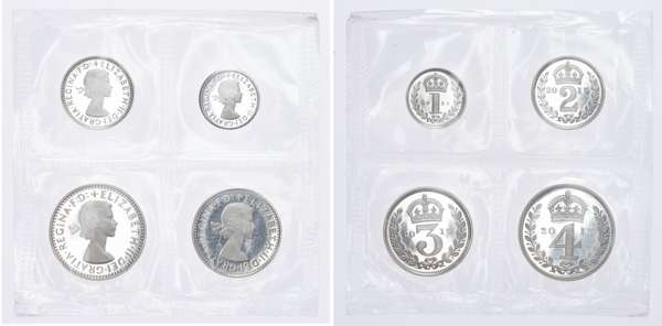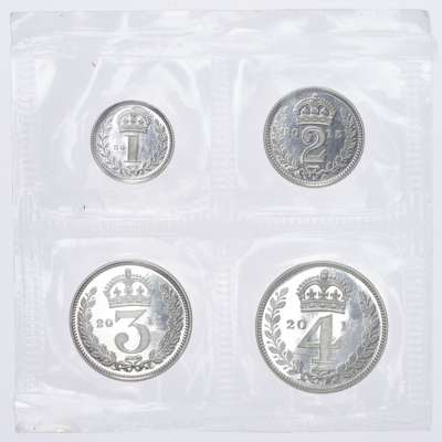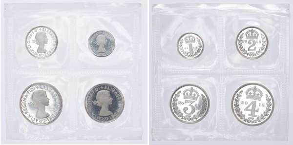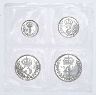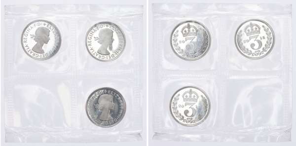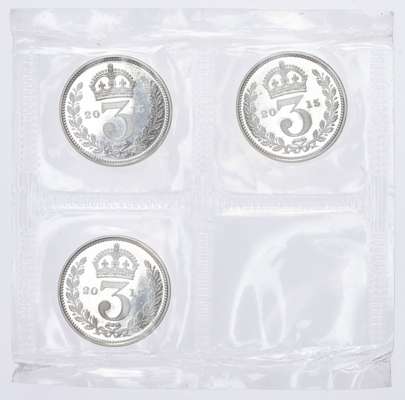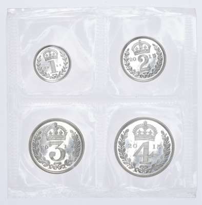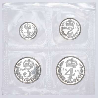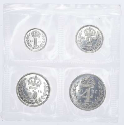 A complete offering of maundy money for Queen Elizabeth II's 89th year (35 coins (8 complete sets plus 3 threepences) equalling a face value of 89 pence) given to Mrs Jean Emerson (S. MS 2015). Five Pound 2015 (S. L38) and Fifty Pence 2015 (S. H39) also given out (37 coins). Brilliant Uncirculated, a rare offering, maundy money all vacupack sealed as issued with two accompanying leather pouches.