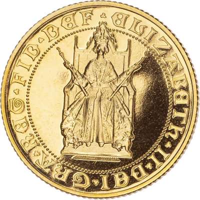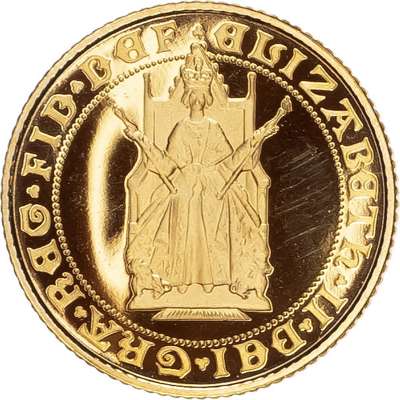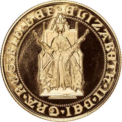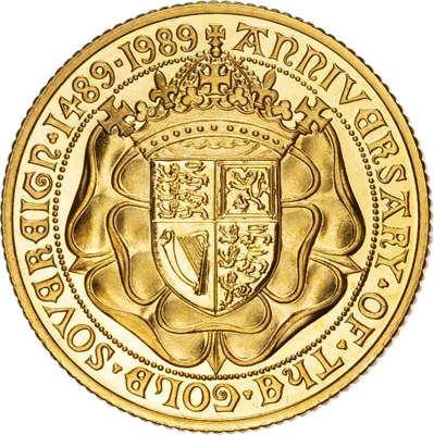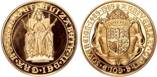 Comprising Two Pound, Sovereign, and Half Sovereign (3), designed by Bernard Sindall. Queen enthroned facing, holding sceptre and rod, legend surrounds ELIZABETH II DEI GRA REG FID DEF. Rev, crowned shield of the Royal Arms upon a double Rose, all within inner circle, outside legend ANNIVERSARY OF THE GOLD SOVEREIGN 1489‑1989 (S. PGS11). Housed in capsules without Royal Mint case, as struck.