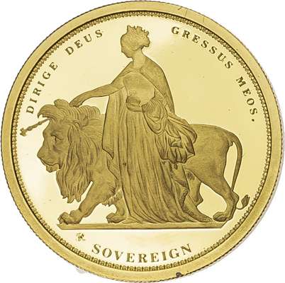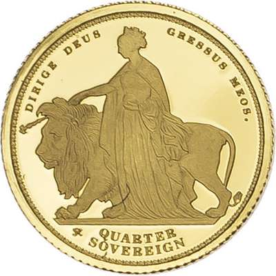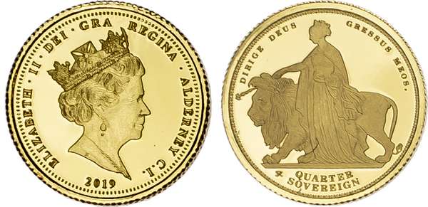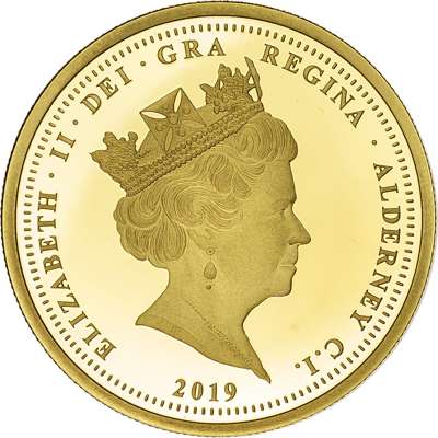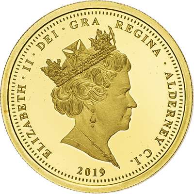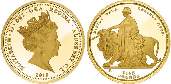 Elizabeth II (1952-2022), Alderney, 24 Carat Sovereign Five Coin Set, 2019, 200th anniversary of the birth of Victoria, comprising gold proof five pounds (36.68gm), double sovereign (14.67gm), sovereign (7.34gm), half sovereign (3.67gm), quarter sovereign (1.83gm). Crowned bust of Elizabeth II right. Rev, Una and the lion. FDC in Hattons of London box with certificate. Five pounds one of 199 struck, double sovereign one of 399 struck.