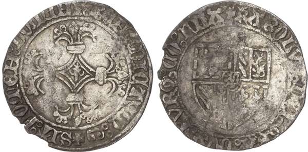 +KAROLVS DEI GRA DVX BVRG CO FLA, arms of Burgundy. Rev, SIT NOMEN DOMINI BENEDICTVM, floriated cross, lily centre, 2.85g. (Vanhoudt 32BG). Near Very Fine, small edge crack.