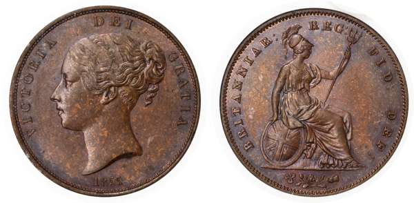 Victoria (1837-1901), Penny, 1855, Far Colon, young head left, W.W. incuse on truncation, rev. Britannia seated right, with ornamental trident, (BMC 1508; Bramah 19; S.3948). Choice uncirculated toned. Encapsulated by ANACS as MS64BN.