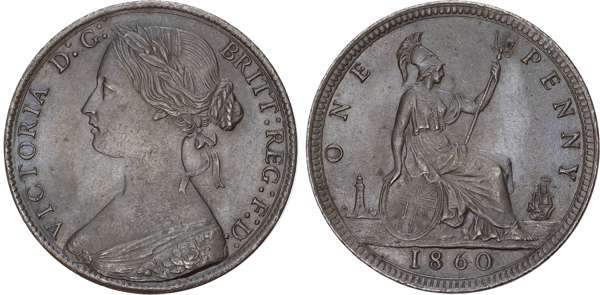 Victoria (1837-1901), Bronze Penny, 1860, Dot on the C of Victoria, Tooth Border, young bust left, reverse Britannia std. right, with shield and trident (S.3954; BMC.1629; F.16 dies 5 + D; Gouby BP1860W H+d). Good extremely fine toned. An unrecorded variety.