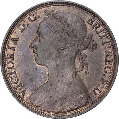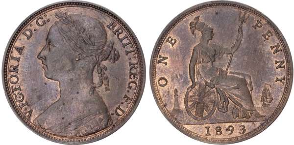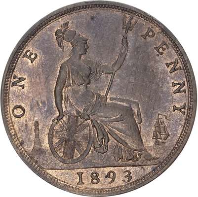 Victoria (1837-1901), Bronze Penny, 1893, date width 14.5 teeth, young bust left, reverse Britannia std. right, with shield and trident (S.3954; BMC 1748; F136 dies 12 + N; Gouby BP1893Ac R+r). Uncirculated with a hint of lustre.