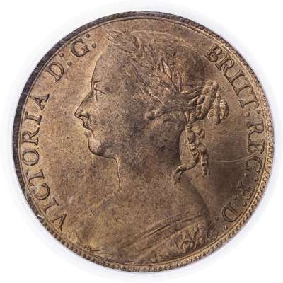 Victoria (1837-1901), Bronze Penny, 1894, young bust left, reverse Britannia std. right, with shield and trident (S.3954; BMC 1749; F138 dies 12 + N; Gouby BP1893Aa R+r). Choice uncirculated with full lustre on both sides. Encapsulated by CGS as 80.