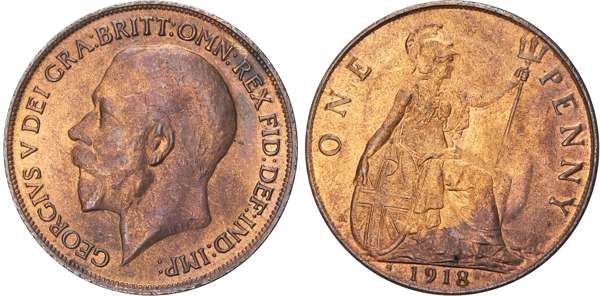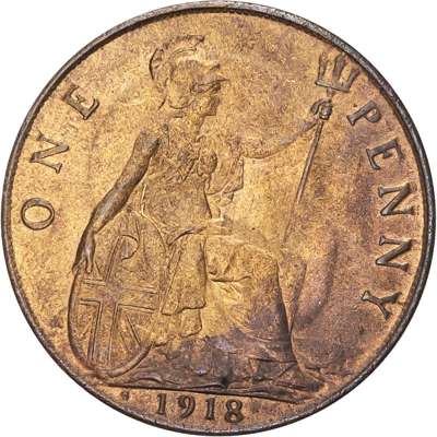 George V (1910-1936), Penny, 1918H, bare head left, rev. Britannia seated right, with shield and trident, (S.4052; F183 dies 2+B; BMC.2253) Good extremely fine with good lustre on both sides.