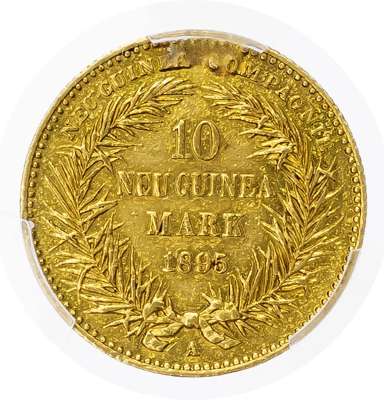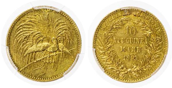 German New Guinea, gold 10 Mark, 1895 A, Berlin mint (KM 8; Fr. 2). In PCGS holder graded Genuine, AU Details – Mount Removed (48121524). Mintage of only 2,000 pieces. Extremely rare, immense rarity with iconic bird of paradise design. Seldom to seen at auction, only nine comparable examples on Coin Archives in the past 20 years. Photo by PCGS.