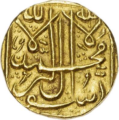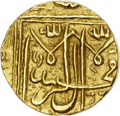 India, Princely States, Bhopal, gold Presentation 1 ½ Mohur, anonymous issue of Shah Jahan Begam (under Victoria as Empress), a presentation piece, AH 1286 / 1869/70 AD, 17.90g (KM Y-D14 for a silver Rupee). Extremely Fine. Extremely rare. A previously unknown presentation gold 1 ½ Mohur of Bhopal State, struck in pure gold. These presentation issues of Bhopal feature the Islamic statement of faith on both sides (Kalima). They are only known to have been struck in silver in literature, we have never handled a gold piece before.