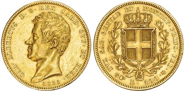 Italy, Sardinia, Carlo Alberto (1831 ‑ 1849), gold 100 Lire, 1835 P, Turin, 32.27g (Fr. 1138, KM 133.1; Pag. 141). Very Fine, some bag marks.
