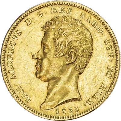 Italy, Sardinia, Carlo Alberto (1831 ‑ 1849), gold 100 Lire, 1835 P, Turin, 32.27g.