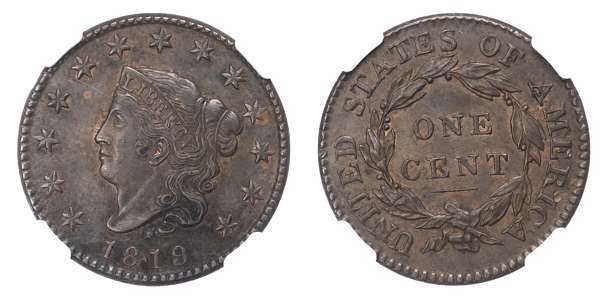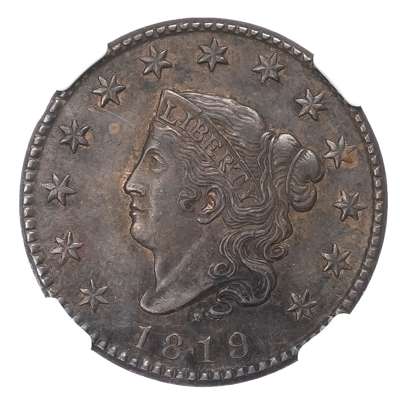USA, Coronet Head, copper Large Cent, 1819, small date (KM 45). In NGC holder graded MS 62 BN (6946509-002).