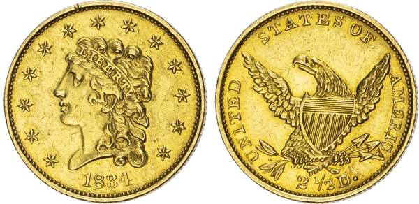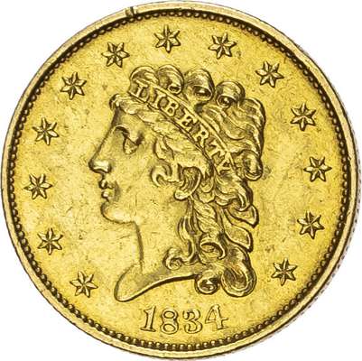 USA, Classic Head, Quarter Eagle, 2 ½ Dollar, 1834, Philadelphia, no motto, 4.18g (KM 56). About Extremely Fine, very minor dig to obverse rim at 12 o’clock, as depicted.