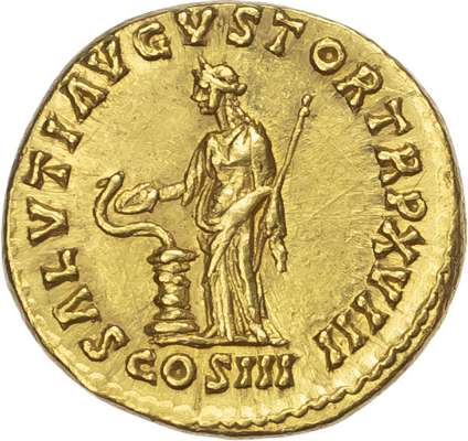 Marcus Aurelius (AD 161‑180) AV Aureus, mint of Rome, AD 163‑164, 6.82g. M ANTONINVS AVG IMP II, laureate head of Marcus Aurelius facing right. Rev. SALVTI AVGVSTORVM TR P XVIII, Salus standing left, holding sceptre and feeding snake which rises from an altar, left, COS III in exergue. (RIC 98 var. (bare‑headed and draped bust). Calicò 1920 (these dies). Extremely Fine. Very Rare.