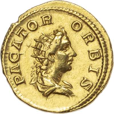 Septimius Severus (AD 193‑211) AV Aureus, mint of Rome, AD 202‑210, 7.20g. SEVERVS PIVS AVG, laureate head of Severus facing right. Rev. PACATOR ORBIS, draped bust of Sol facing right. (RIC 282; Calicò 2487a (same reverse die)). Good Very Fine. Very Rare.