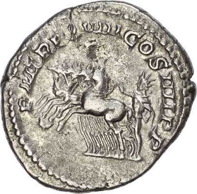 ANTONINVS PIVS AVG GERM, radiate and draped bust of Caracalla right. Rev. PM TR P XVIII COS IIII P P, Sol driving quadriga left. (RIC 293e). Good Very Fine.
