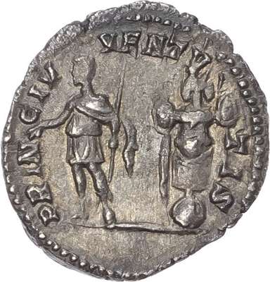 P SEPT GETA CAES PONT, draped bust of Geta right. Rev. PRIN-C IV-VENTVTIS, Geta standing left, trophy of arms behind.(RIC 18; RSC 158a). Good Very Fine or better. Pleasing cabinet tone.