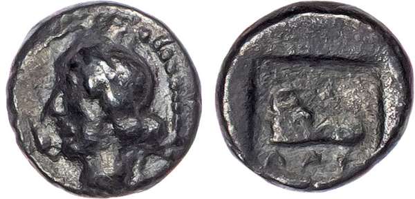 Thessaly, Larissa (c. 479-460 BC) AR Obol, 1.00g. Head of the nymph, Larissa, facing left. Rev. Λ-Α-R, sandal of Jason right. (BCD Thessaly 140). Good Very Fine.