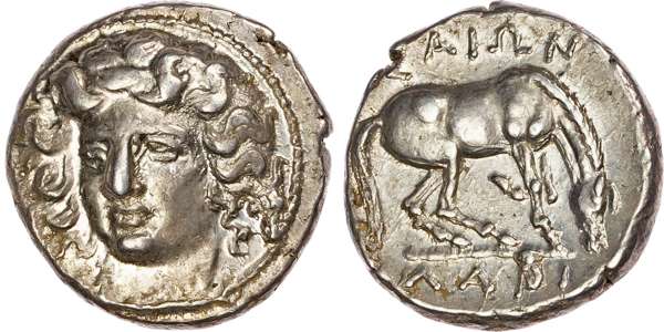 Thessaly,Larissa(c. 356-320 BC) AR Drachm, 6.19g. Head of the nymph Larissa facing slightly to the left.Rev.ΛAPIΣ / AIΩN, horse right, preparing to lie down. (HGC 4, 454; BCD Thessaly II, 315-6).Good Extremely Fine. Lustrous.