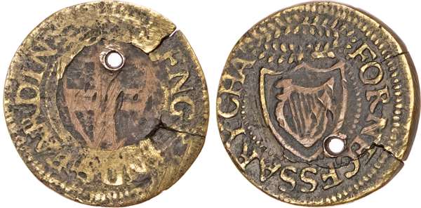 ENGLANDS FARDIN, laurel wreath surmounting St George's shield, rev. FOR NECESSARY CHA, Irish shield, 3.18g, (Montagu 3; Batty 372; BMC 384; North 2741). Pierced, a bold fine.