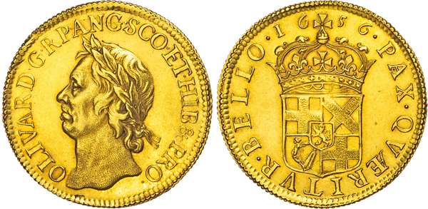 Laureate head left, legend with toothed border surrounding. Rev, crowned quartered shield of arms of the Protectorate, date either side of crown, legend and toothed border surrounding, (S.3225; N.2744; Schneider 367; WR 39 R2; EGC.75; Lessen A.2). Near extremely fine, some underlying mint brilliance. Very skilfully pierced and plugged at 12 o’clock.