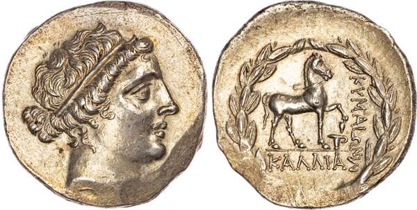 Aeolis, Kyme (c. 165-140 BC) AR Tetradrachm, Stephanophoric type, Kallias, magistrate, 16.04g. Head of the Amazon Kyme facing right. Rev. ΚΥΜΑΙΩΝ / KAΛΛIAΣ, horse stepping right, cup below, all within a wreath. (Oakley obverse dies 37/-; SNG Copenhagen 103). Nearly Extremely Fine. A pleasing portrait.