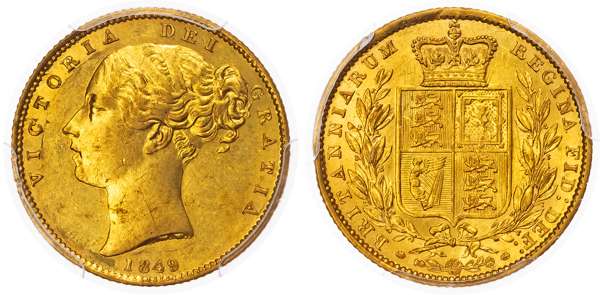 Victoria (1837-1901), Shieldback Sovereign, 1849, London.