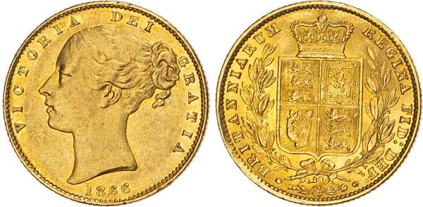 Victoria (1837-1901), Shield-Sovereign, 1866.