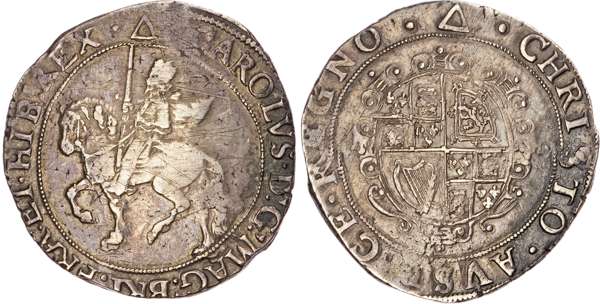 Tower mint (under King), mm. triangle (1639-1640). Third later horseman left, crowned and with sword, cloak flying from shoulder, Rev. Oval draped shield, C R at sides, 15.13g/5h. (N. 2211; S. 2775). Very Fine, some parts better, some light scratches made in antiquity, reverse better.