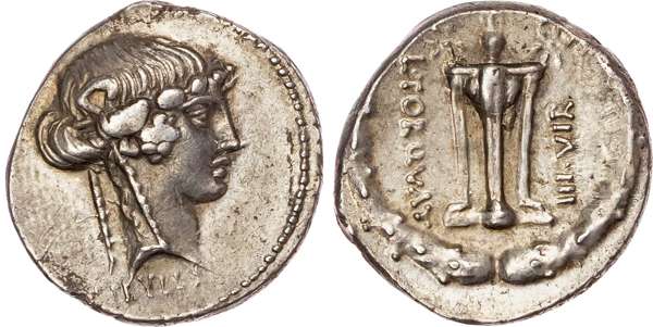 SIBYLLA, head of Sibyl right, wearing a wreath or ivy. Rev. L·TORQVAT / III·VIR, tripod topped with amphora, two stars either side, all within a torque. (Crawford 411/1b; Sydenham 836). About Extremely Fine.