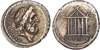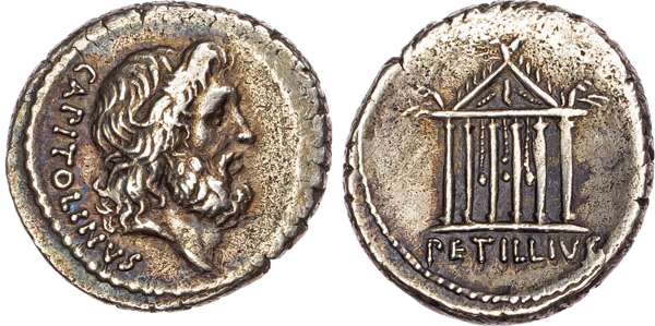CAPITOLINVS, bare head of Jupiter right. Rev. The Temple of Jupiter Capitolinus: hexastyle temple with decorated pediment and garlands, PETILLIVS in exergue. (Crawford 487/1; Sydenham 1149). Good Very Fine.