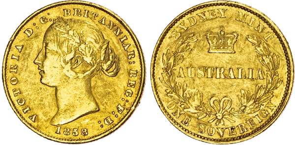 Australia, Victoria (1837 1901), gold Sovereign, 1858, Sydney mint, 7.95g (KM 4; Fr. 10). Very Fine, minor scratches and contact marks.