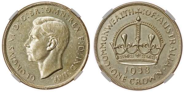 Australia, George VI (1936-1952), silver Crown, 1938 (KM 34). In NGC holder graded AU 58 (8222275-001). A key date for the two year type, with a much smaller mintage.