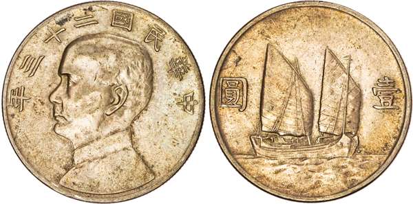 China, Republic, Sun Yat-Sen, silver Junk Dollar, 1934