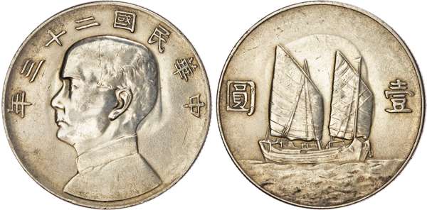 China, Republic, Sun Yat-Sen, silver Junk Dollar, 1934, 26.70g (LM 110; K. 624; KM Y-34). About Extremely Fine. Sold as seen, no returns.
