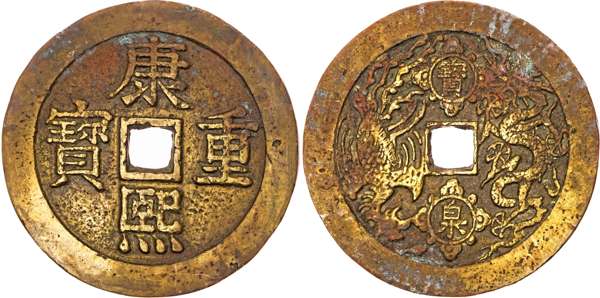 China, Qing Dynasty, Emperor Sheng Zu (Kang Xi), brass Dragon & Phoenix charm, also called Diamond Jubilee Charm, no date (1713) obverse inscribed 'Kang Xi Zhong Bao', reverse showing dragon and phoenix, 59mm, 60.62g (H. 4.3432). Very Fine, some residue to the surfaces. Sold as seen, no returns.