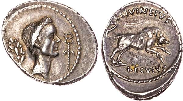 Laureate head of Caesar right, olive branch behind, caduceus before. Rev. Bull leaping right. (Crawford 494/24; Sydenham 1106). Good Very Fine. Rare. Beautiful cabinet tone.