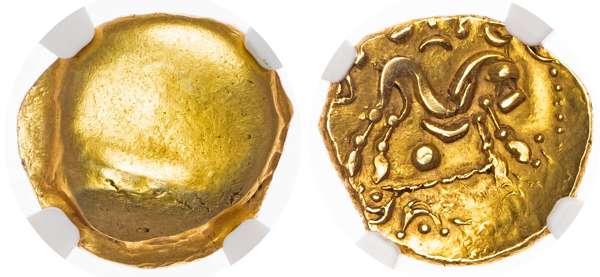 Stylised horse right, abstract symbols above, ground line, pellets and crescents below. Rev: Blank mound with an uneven surface. (ABC 16; VA 54-1). Encapsulated by NGC: Ch XF 4/5, 4/5. A splendid example, free from the scratches that plague this issue.