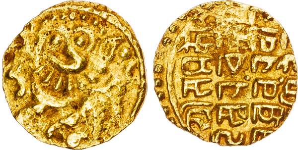India, Kadambas of Goa, Interregnum, Mayindeva the Yadava (Governor in rebellion, c. 1230-1250 AD), gold Gadyana of Kadamba type, mythical lion (Sardula). Rev. Devanagari legend in four lines, 4.40g (Mitch. South I 242). Very Fine, extremely rare, only a couple other pieces recorded on Coin Archives.