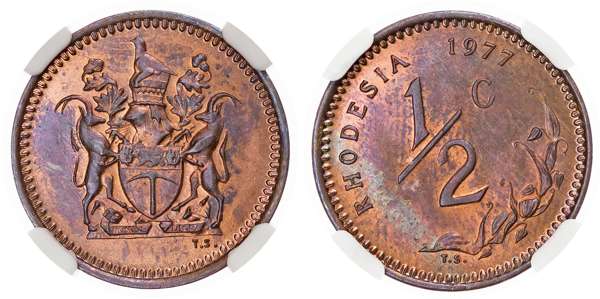 Rhodesia, Republic (1970-1977), bronze Half Cent, 1977, engraver: Tommy Sasseen, 3.00g (KM 9; Schön 47). In NGC holder graded MS 65 BN (8220056-002). Shared for the second finest known, only one known finer in the NGC census.