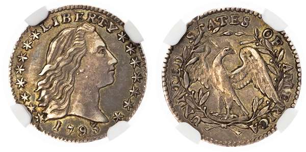 USA, silver Flowing Hair Half Dime, 1795, Philadelphia (KM 15; Cr. 21). In NGC holder graded AU Details – Bent (8220061-001). This coin type was only struck for two years. It is extremely rare, especially in this condition. Although graded as ‘Bent’ the coin is in a remarkable state of preservation.