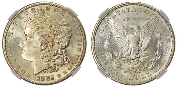 USA, silver Morgan Dollar, 1882, San Francisco, 26.75g (KM 110). In NGC holder graded MS 63 (6029119-003). Cartwheel lustre, beautiful piece.