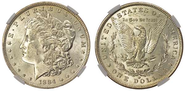 USA, silver Morgan Dollar, 1884, New Orleans, 26.75g (KM 110). In NGC holder graded MS 63 (6029119-007).