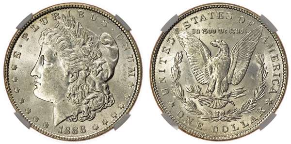 USA, silver Morgan Dollar, 1888, Philadelphia, 26.75g (KM 110). In NGC holder graded MS 62 (6029118-024).