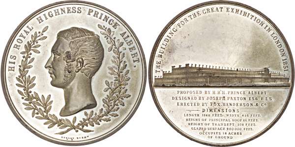 White Metal medal by T. Ottley. Bare head of Prince Albert left, within an open olive and oaken wreath, HIS ROYAL HIGHNESS PRINCE ALBERT, rev. View of the Exhibition building. 73.5mm., 142.48. (BHM 2446; E 1458), Good Extremely Fine with much original brilliance.