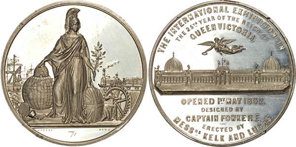 Britannia standing facing, hand on beehive topped globe, steam-train and ships behind, rev. view of the Exhibition building, angel flying above, 74mm., 113.86gm. (Allen 195; BHM 2733). Apart from three rim nicks, Good Extremely Fine with full lustre and mirror surfaces, very rare.