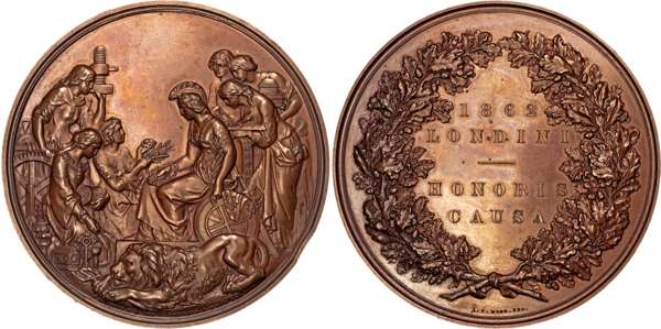 Bronze medal by Leonard Wyon in original leather and velvet lined box, awarded to Miss Lawson Class IV. Britannia seated left, receiving personifications of Industry, Science, Art, and Agriculture, with lion laying on trident in foreground, rev. 1862 / LONDINI / HONORIS / CAUSA within garlanded oak wreath. 76.5mm., 219.07gm. (Brown NGC; BHM 2747; Eimer 1553). Good Extremely Fine with marvellous luminescent bronze toning small obv. rim bruise at 5 o’ clock. Box pristine.
