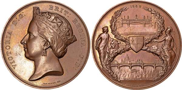 Copper medal by G.G. Adams for the Corporation of the City of Londo., Coroneted bust of Victoria left, rev. City of London shield dividing views of both bridges, figures of Londinia and Britannia at sides, 76.5mm, 249.42gm. (W & E 1126.1; Welch 11; BHM 2906; E 1604). Good Extremely Fine, beautiful choc. brown toning with underlying iridescence.
